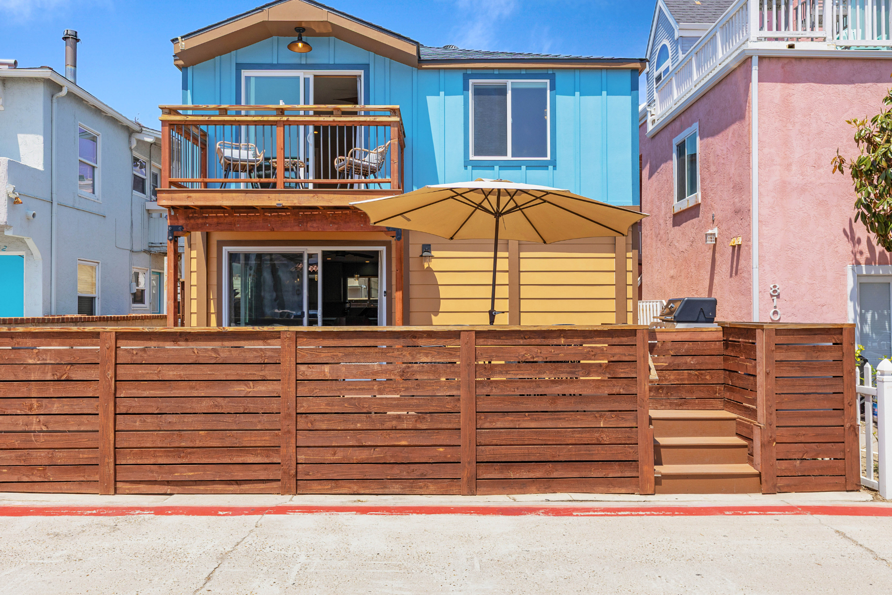 This modern upscale 2 story beach house completed full construction in 2024. Features a full area raised front deck with a large bay view, an upper balcony with full ocean views of surfers and dolphins. Also has a large fenced in private backyard with surrounding raised decks and a Jacuzzi. Very large desk for 2 with an ocean view while working. Living room has a 75 inch smart TV. Also features a Weber BBQ and side by side parking for 3 with an EV plug-in.