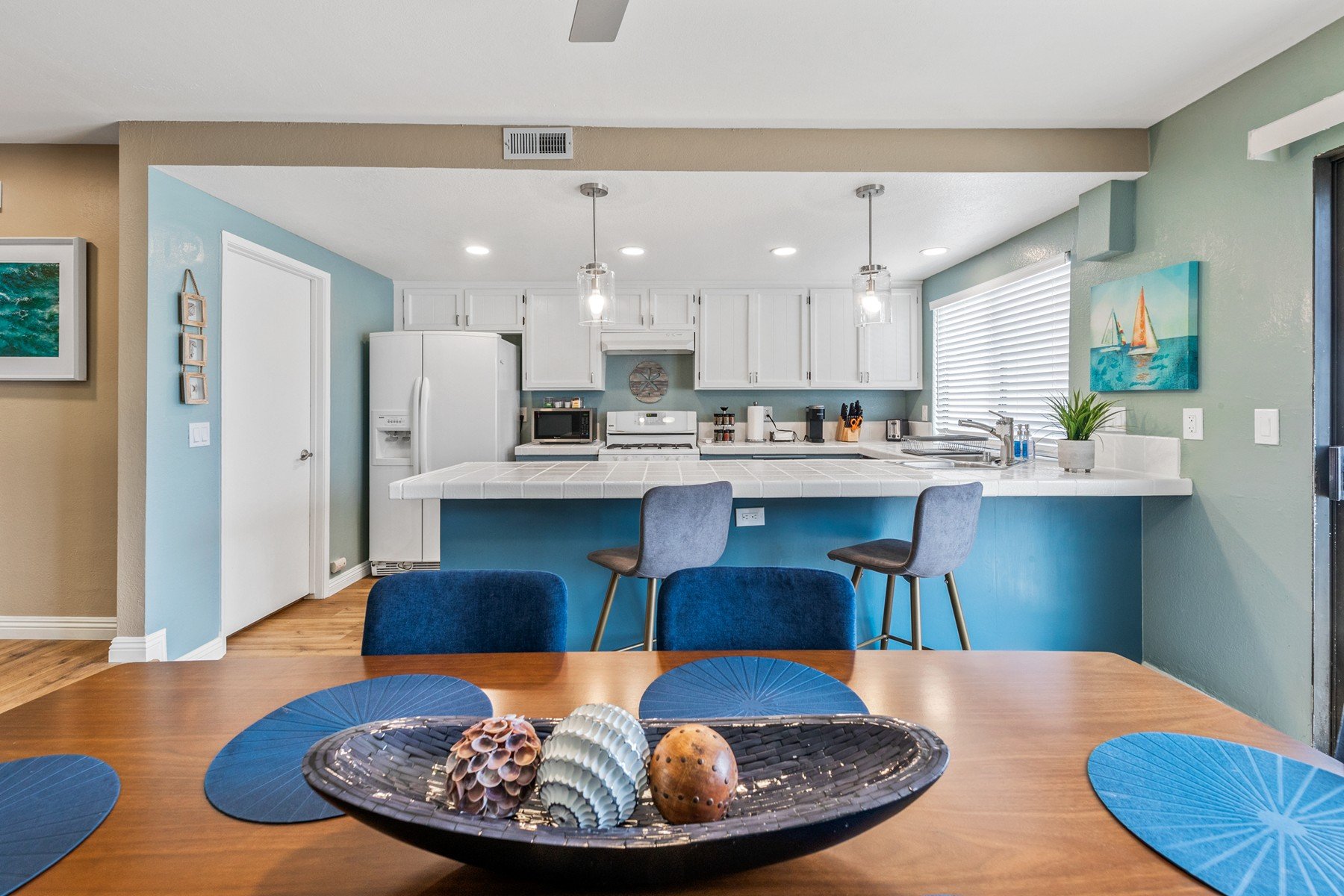 This Huntington Beach house has 3 bedrooms plus a large primary suite. It has two and a half bathrooms to comfortably get the whole family ready quickly. A very large kitchen and dining area for a big feast and plenty of TV's.